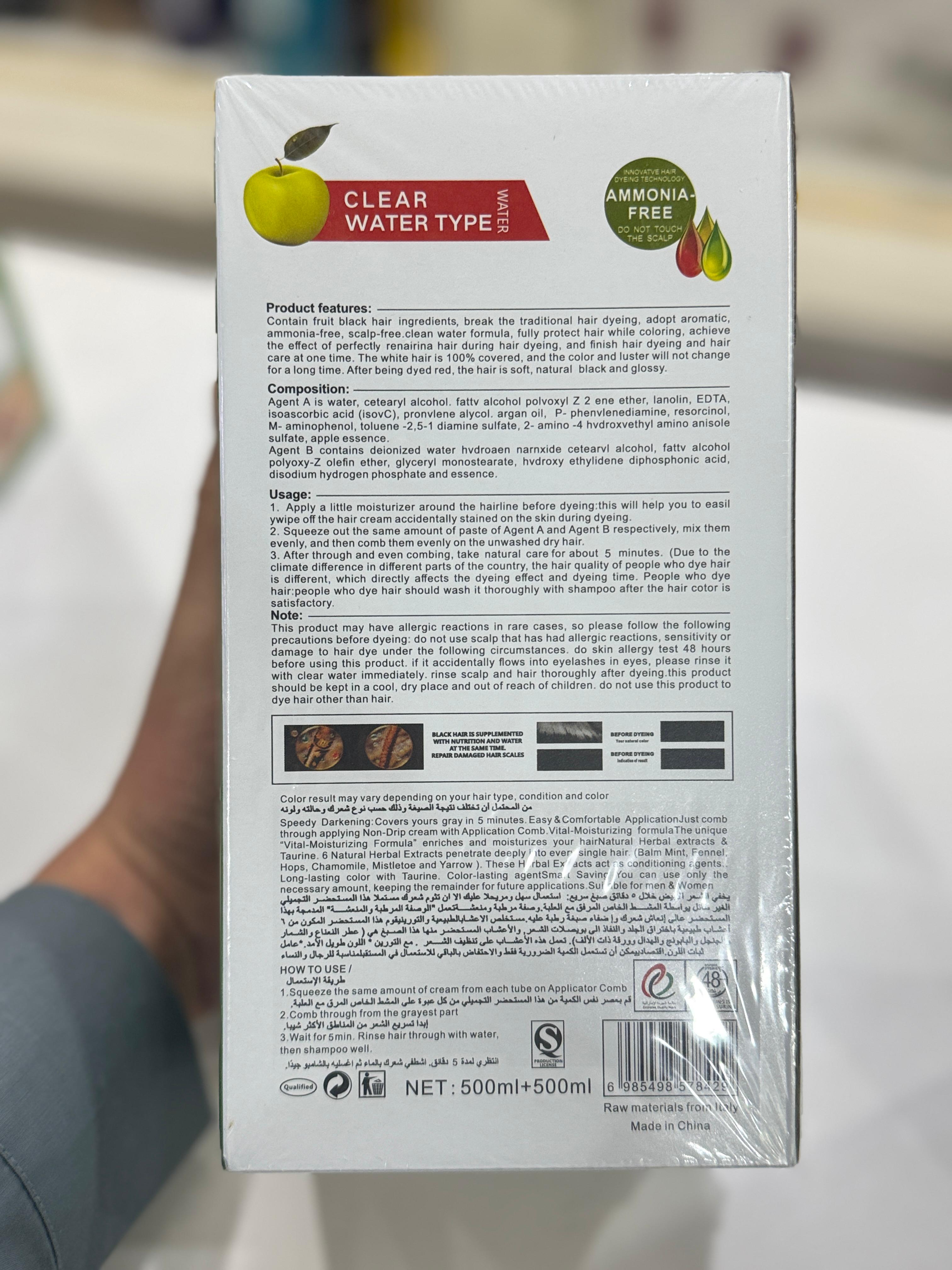 Apple Hair Color Cream is an ammonia-free, non-toxic cream-based hair coloring solution designed for smooth, even, and comfortable application. This pack includes 2 sachets of 500ml each, giving a total of 1000ml, suitable for multiple uses.
